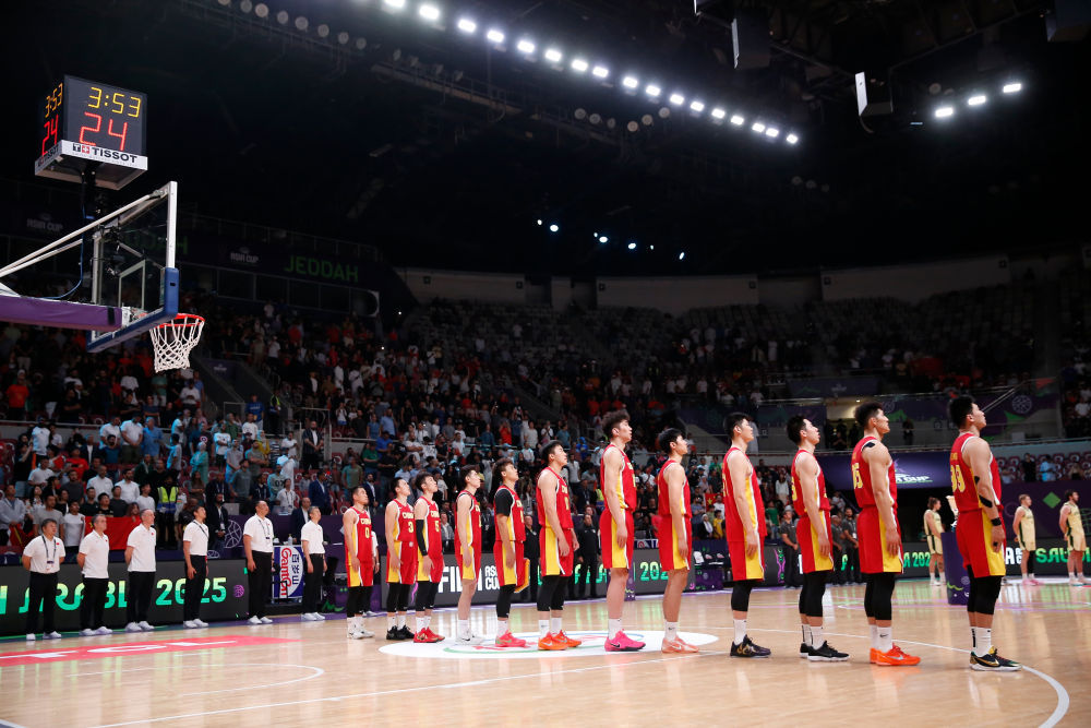8月17日,在沙特阿拉伯吉达举行的2025国际篮联亚洲杯决赛中,中国队89比90不敌澳大利亚队,得到亚军。图为中国队球员在赛前奏唱国歌庆典上排队。新华社记者 王东震 摄